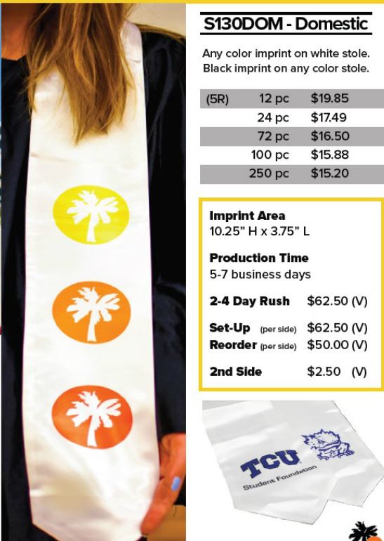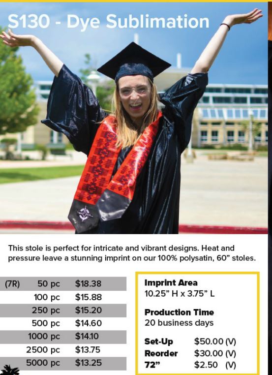 If you are in need a stole that allows for unlimited colors or an “all over design”, this is your stole! Keep in mind, for this stole you need a REAL 25 business days. But there is no LIMIT to what you can print on this. If you need full color imprint and you only have about 5-10 business days, you will need to go with the “White Stoles” with Full Color imprint.